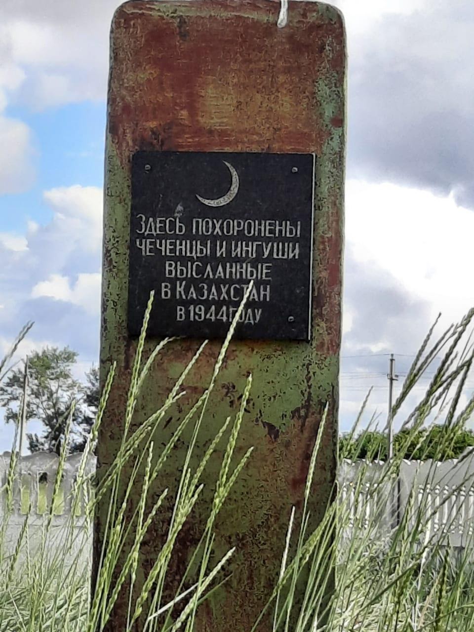 1944 жылы Қазақстанға жіберілген шешендер мен ингуштарға естелік тас. Бетон қоршау бар.